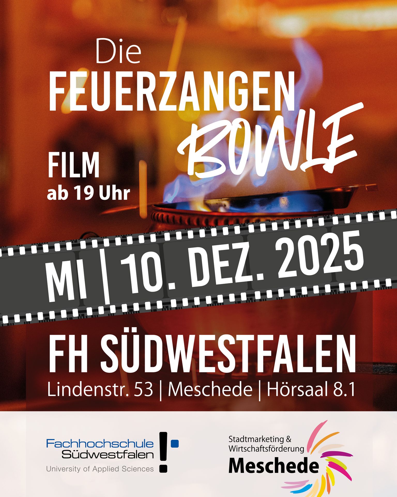 Einlass ist ab 18.00 Uhr, der Kinoabend beginnt um 18.30 Uhr mit dem traditionellen Ausschank der Feuerzangenbowle. Die Veranstalter bitten darum, eigene Becher mitzubringen. Es gibt außerdem die Möglichkeit, vor Ort Meschede-Tassen zu erwerben. Um 19 Uhr startet der Film im Hörsaal 8.1 am FH-Campus in der Lindenstraße 53.