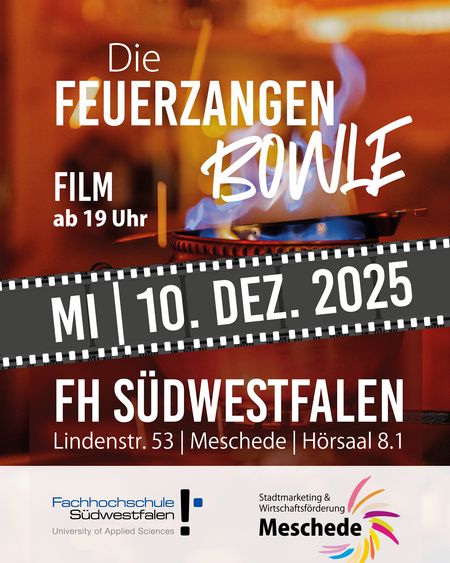 Es ist eine liebgewonnene Adventstradition an vielen Universitäten: Der Kultfilm „Die Feuerzangenbowle“ mit Heinz Rühmann verwandelt in diesem Jahr auch den Hörsaal der Fachhochschule Südwestfalen in ein vorweihnachtliches Kino. Am Mittwoch, 10. Dezember, laden die Fachhochschule Südwestfalen und das Stadtmarketing Meschede alle Filmfreundinnen und Filmfreunde zum gemeinsamen Schauen, Schmunzeln und Genießen ein.