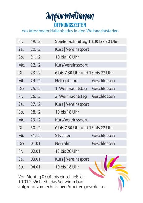 An gestzlichen Feiertagen in NRW bleibt das Hallenbad, sofern nicht anders angekündigt geschlossen. Ebenfalls bleibt das Bad an Heiligabend und Silvester geschlossen.