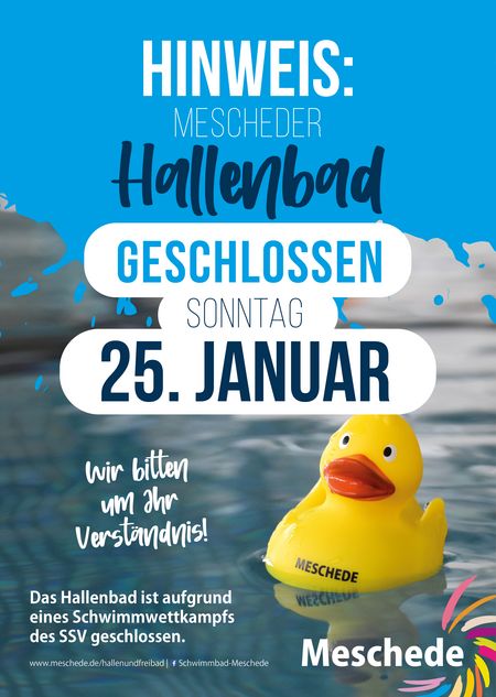 Wegen des Schwimmfestes des SSV Meschede am Sonntag, 25. Januar, bleibt das Mescheder Hallenbad an diesem Tag geschlossen.