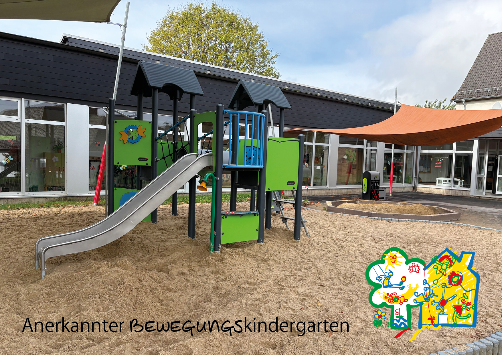 Das weitläufige Außengelände lädt die Kinder ein, sich auszutoben und ihre motorischen Fähigkeiten und Fertigkeiten zu erproben. Dazu nutzen die Kinder die Rutsche, verschiedene Klettermöglichkeiten, den großen Sandkasten mit Wasserpumpe und Matschanlage und die Wippe. Hinter dem Kindergarten haben die Kinder zusätzlich eine Spielmöglichkeit.