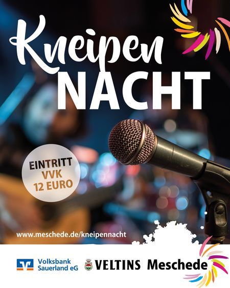 Einmal zahlen und die Party beginnt … Im Frühjahr und Herbst bringen Live-Acts verschiedener Musikrichtungen die Stadt zum Kochen. Egal ob du ein Rocker, Popper, Punker oder Chiller bist - in dieser Nacht bekommen alle etwas auf die Ohren. Dabei sind Coverbands ebenso wie Hip-Hop-Künstler, die das Mescheder Nachtleben an diesem Abend pulsieren lassen. In mehreren Kneipen wird Meschede von Künstlern aus der Region und dem Rest von Deutschland unsicher gemacht.