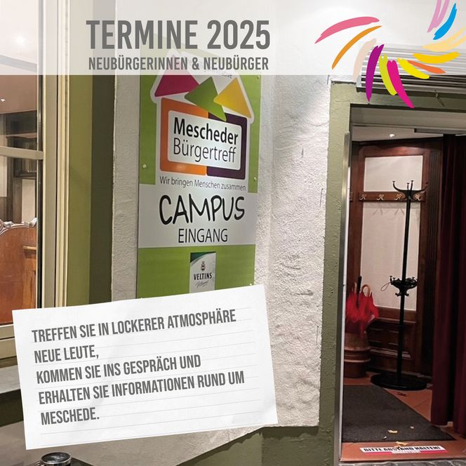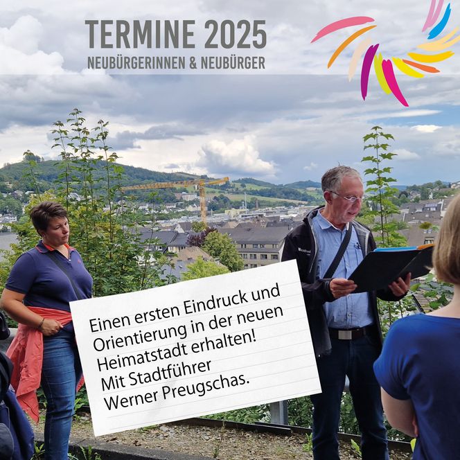 Die Begrüßungsveranstaltungen für Hinzugezogene sind für dieses Jahr bereits abgeschlossen. Auch im kommenden Jahr planen wir wieder vielfältige Formate, um Ihnen das Ankommen in Meschede zu erleichtern – von Informationsveranstaltungen über Stadtführungen bis hin zu Begegnungsangeboten.