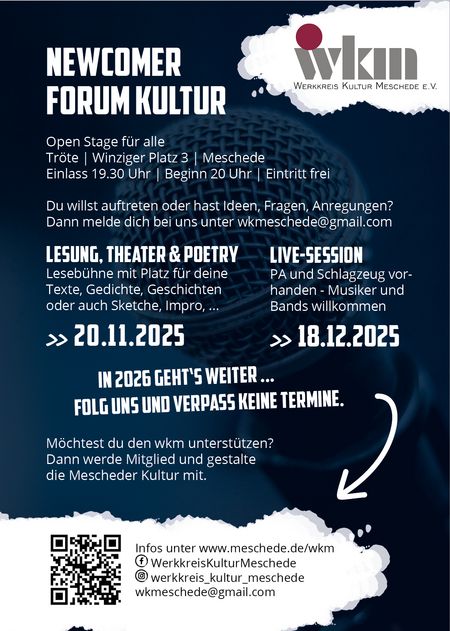Der WKM möchte auch weiterhin das kulturelle Geschehen in Meschede mit seinen Angeboten bereichern und freut sich über Interessierte jeden Alters, die das Kulturangebot in Meschede mitgestalten möchten.