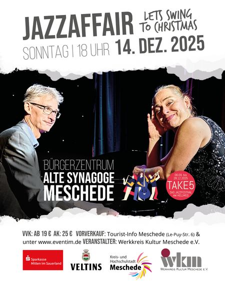 Das Musikerpaar, das bereits seit 30 Jahren zusammen spielt und des Öfteren schon beim WKM aufgetreten ist, kommt in diesem Jahr als Duo JAZZAFFAIR. In der intimen Kleinstbesetzung interpretieren sie unter dem Titel „Let’s swing to Christmas“ weihnachtliche und winterliche Lieder aus der ganzen Welt, außerdem Stücke ihres aktuellen Konzert Repertoires sowie eigene Kompositionen.