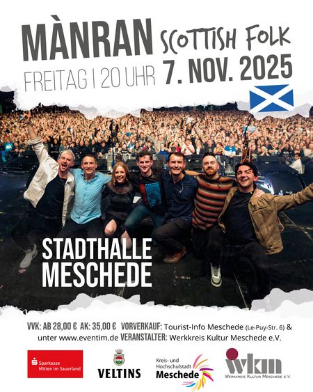 Seit über 15 Jahren zählt Mànran zu den Größen der schottischen Folk-Szene. Die preisgekrönte Band begeistert mit einer einzigartigen Mischung aus traditionellen und modernen Klängen. Ihr Sound vereint englische und gälische Lieder mit Dudelsack, Geige, Akkordeon, Flöte sowie Gitarre, Bass und Schlagzeug. Über 30 Länder hat die Band bereits bereist und mit energiegeladenen Auftritten überzeugt. Ausgezeichnet als „International Artist of the Year“ in Australien, bleibt Mànran ein Aushängeschild für schottische Musik – tief verwurzelt in der Tradition, stets offen für Neues.
