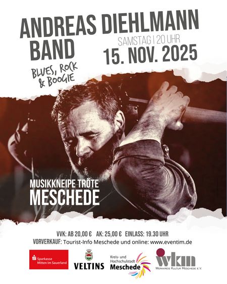 Am Samstag, 15. November 2025 ist mit der Andreas Diehlmann Band aus Kassel eine Live-Band der absoluten Extraklasse in der Kreis- und Hochschulstadt Meschede zu Gast. Die krachende Mischung aus Texas Blues, Rock und Boogie sorgt dafür, dass das Tanzbein nicht still steht. Eingängige Melodien und Texte laden das Publikum dabei immer wieder zum Mitmachen ein. Die Band um den Ausnahmegitarristen und Sänger Andreas Diehlmann zählt zu den angesagtesten Acts ihres Genres und hat sich in den letzten Jahren deutschlandweit eine große Fangemeinde erspielt. Sieben Studioalben in sieben Jahren zeugen von der außergewöhnlichen Kreativität des Powertrios, das spätestens mit dem Gewinn des German Blues Award in der Kategorie "Beste Band" den Status als Geheimtipp hinter sich gelassen hat. Zum zweiten Mal in Meschede zu Gast präsentiert die Andreas Diehlmann Band feinsten Rock, erdig und voller Energie, der so richtig nach vorne geht. Das Konzert findet standesgemäß in der intimen Clubatmosphäre der Rockkneipe "Tröte" am Winziger Platz 3 statt. Es wird eng, es wird laut und es wird heiß. Das Kartenkontingent ist auf 100 Plätze limitiert. Schnell sein lohnt sich, um den besten Texas Blues zu erleben, der nicht aus Texas kommt. Einlass ist um 19:00 Uhr, der Konzertbeginn um 20:00 Uhr.